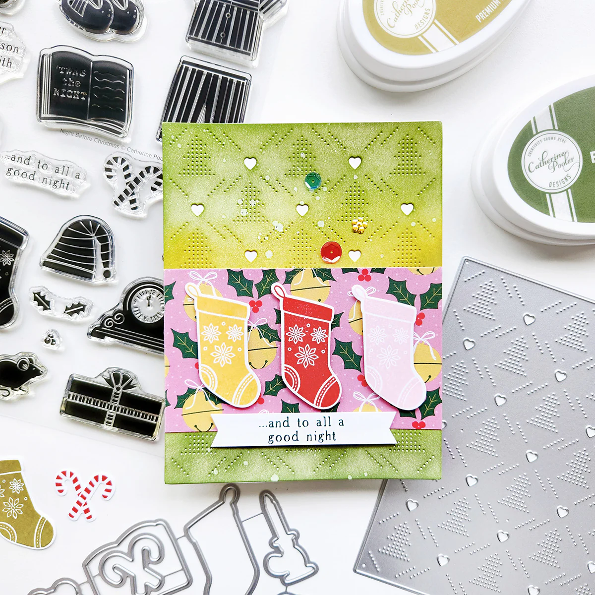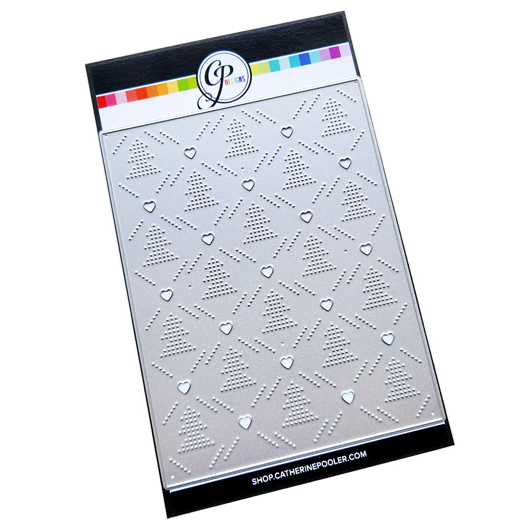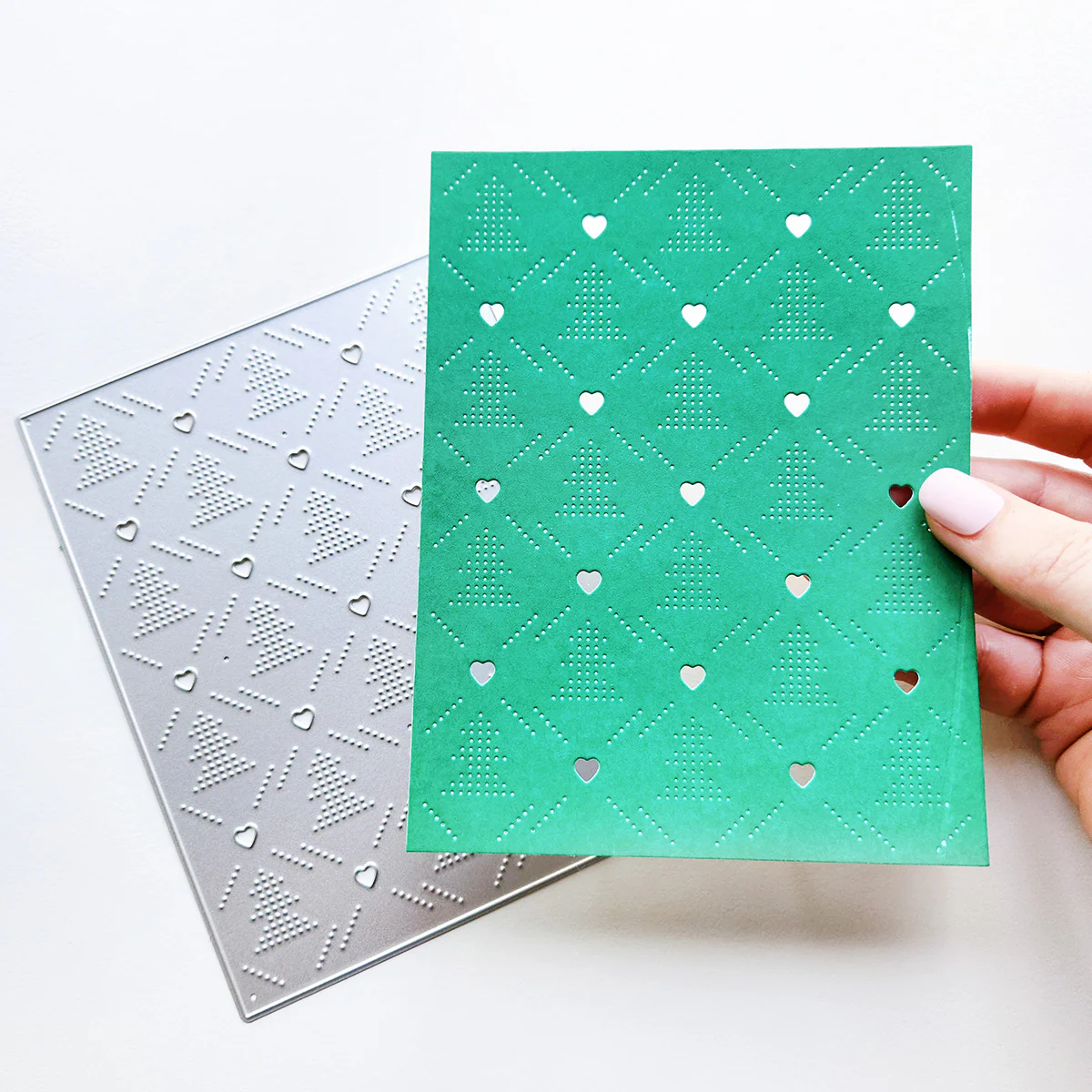 Bring the nostalgia of a handmade holiday to your projects with the Christmas Embroidery Cover Plate Die. Featuring a stitched-inspired pattern of Christmas trees and hearts, this design evokes the charm of a treasured gift from grandma.