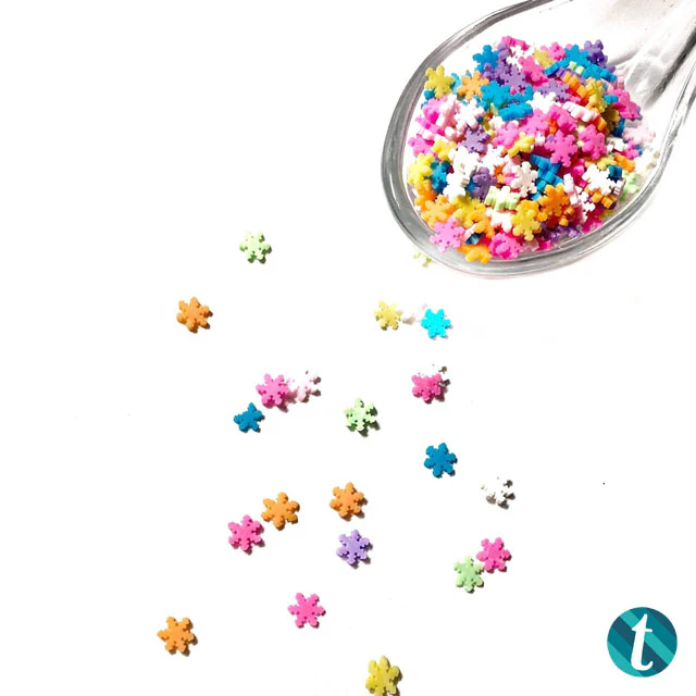 This embellishment selection contains a mix of 5mm snowflakes in a rainbow of colors. These sprinkles are packaged in a labeled plastic storage box.