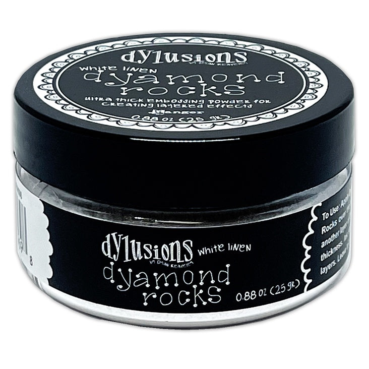Ultra thick embossing powder for creating layered effects. Add color, dimension, and texture to art journal, mixed media & paper craft projects with Dylusions Dyamond Rocks. For use with Dyamond Dust, Mediums, Boards, Stamps and more.