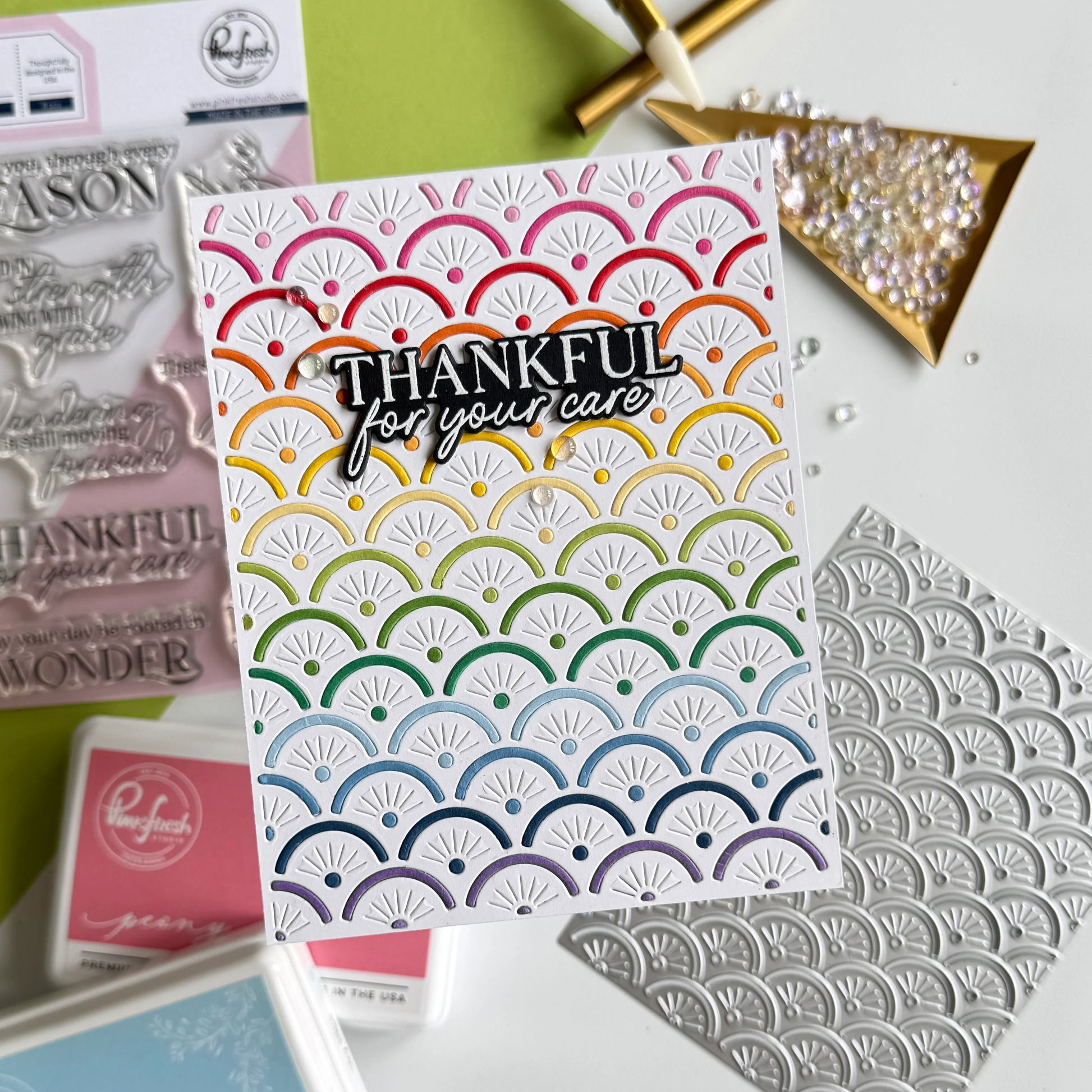 Add radiance to your backgrounds with the Scallop Glow coverplate die, designed by Inna Moreva. This elegant design features overlapping scallops with glowing stitched rays, resembling rising suns. The repeating pattern creates balance and texture, making it ideal for layering behind sentiments, florals, or bold focal points.