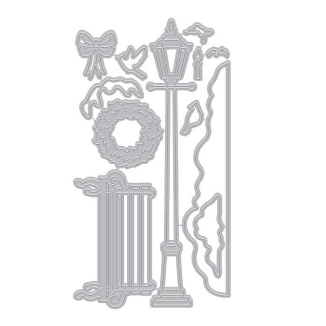 The bench meaures 2 1/2" x 1 1/2", the street lamp measures 1" x 5 1/4", and the wreath measures 1 1/4" x 1 1/4".
